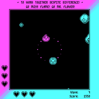 Scored 1310 after learning to focus on using Miss Flame more, thanks to you. Mr. Flower's matching the enemies' color is definitely a bad game design aspect, but this minigame is quite interesting otherwise. I could definitely see it being developed further as a full-fledged game if there were levels with more interesting, noncircular tracks for the two characters to move along.